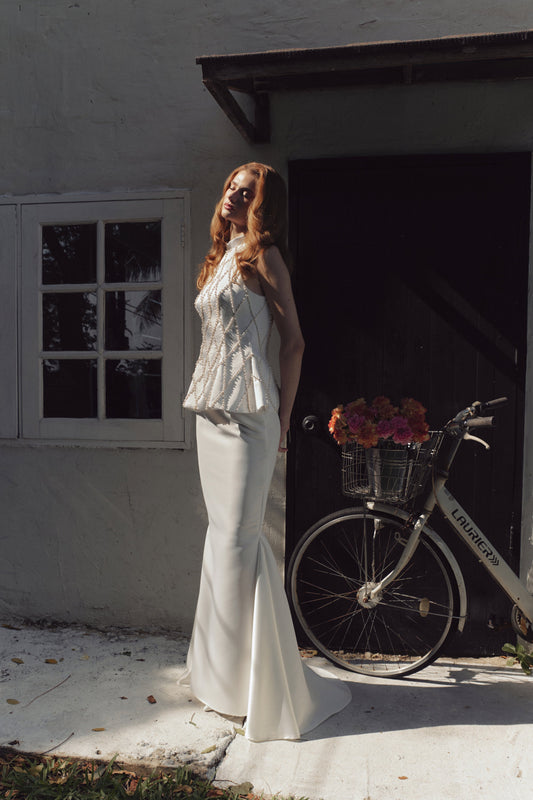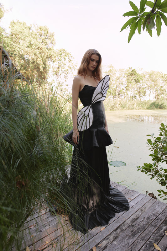Delicate fabrics and flowing silhouettes evoke the grace of butterflies in flight, while intricate beaded embroidery, reminiscent of delicate cages, symbolises the impermanence of life and the strength required to break free from constraints. Each piece is designed to capture the beauty of metamorphosis, blending elegance with a touch of whimsy. Perfect for the modern romantic, this collection honors love, freedom, and the magic of new beginnings.