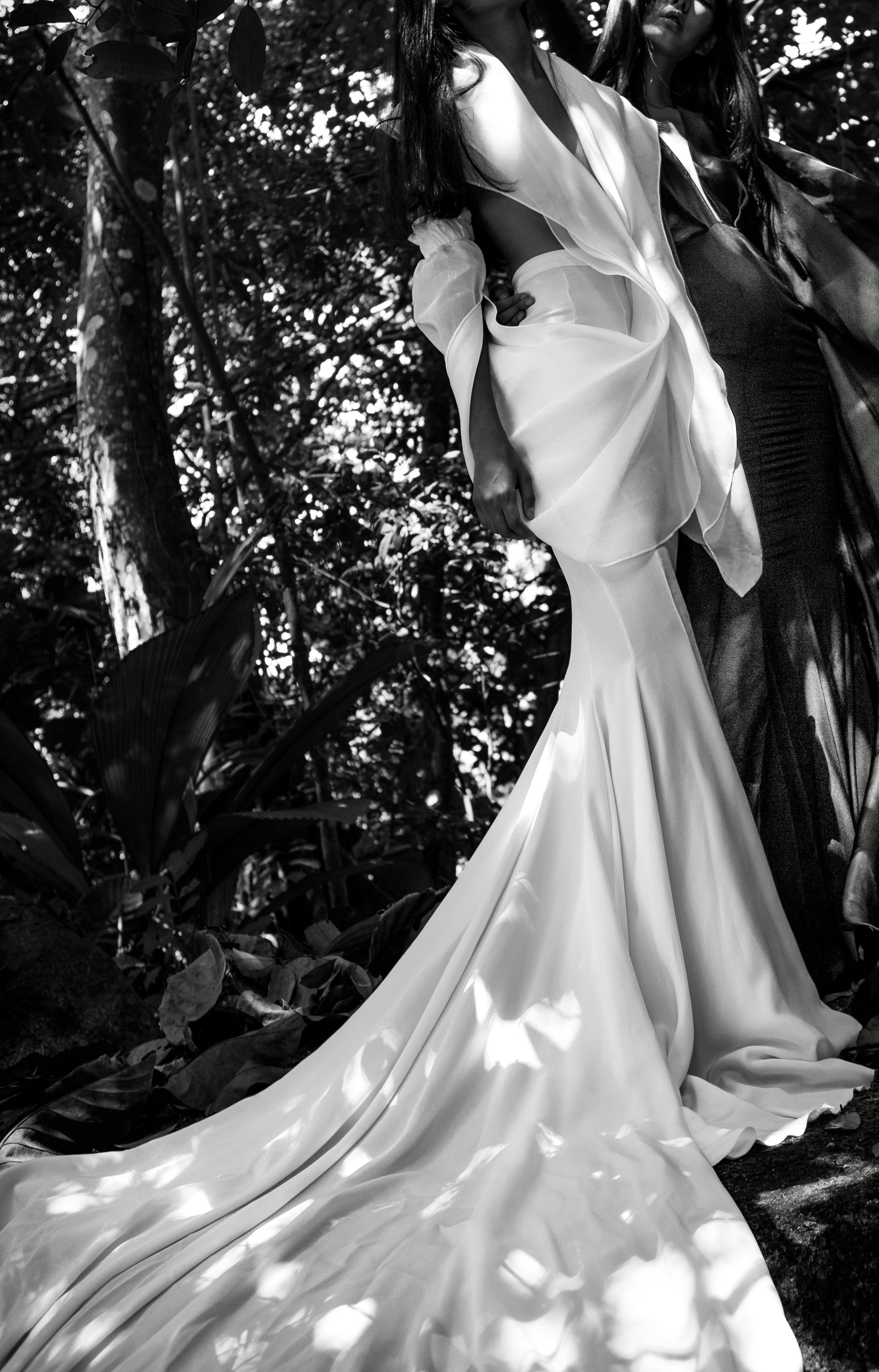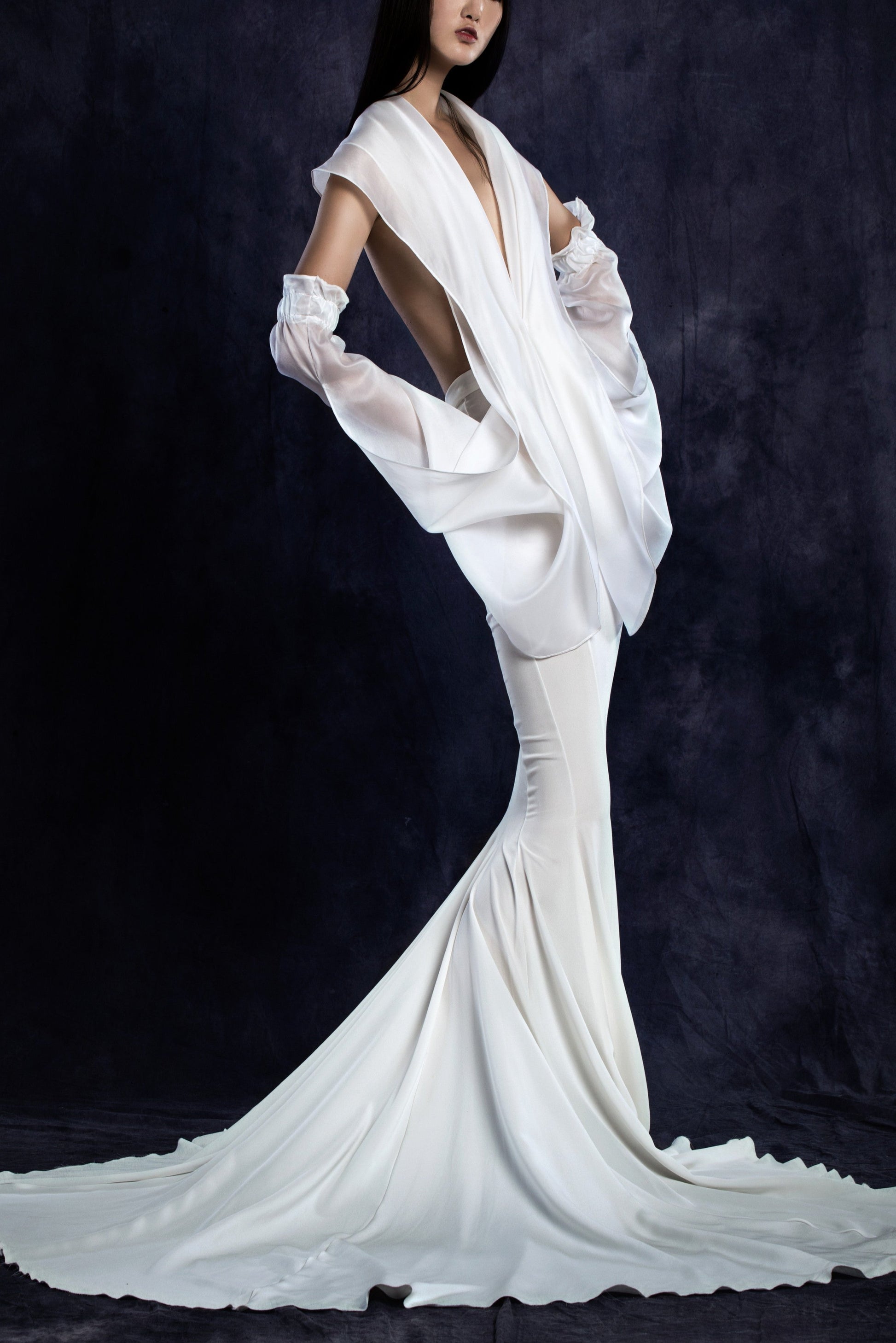 Bridal two-piece set. Backless cape made from plushy double organza that drapes beautifully around the neck collar, continuing down through to the arms, creating a stunning structural silhouette. Desirable drama is created through the fabric’s flounce and bareback element of the organza cape. This look is paired with a 9-panelled silk crepe mermaid skirt, bringing to life the story of the 9-tailed fox that plays as the key inspiration for our collection.