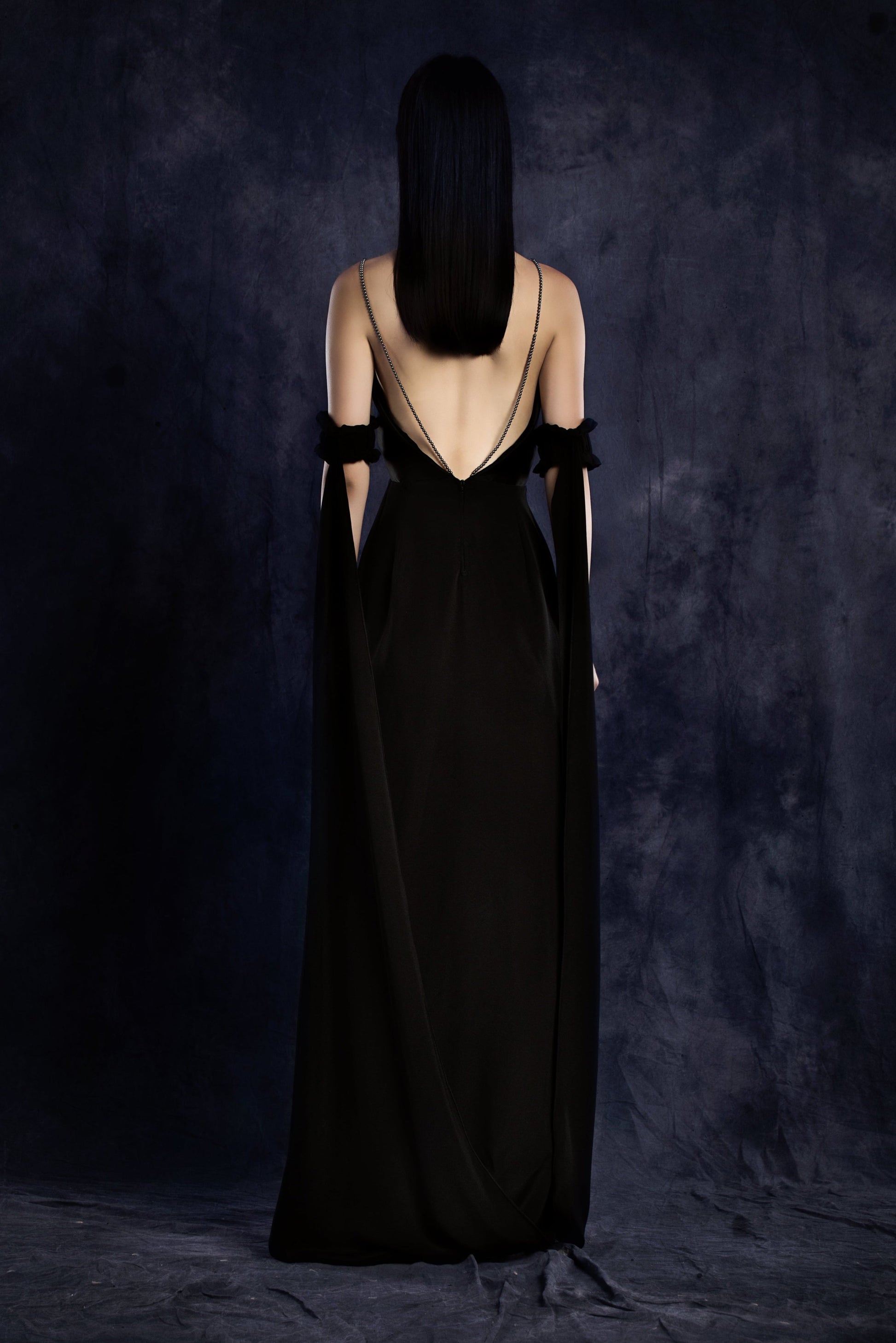 Our take on the elevated little black dress. A key design element of this collection is the continuity of fabric. In this dress, the right sleeve is connected to the hemline of the skirt front, while the left sleeve is connected to that of the back, creating an interesting draped silk crepe dress with two high slits. This dress also features a draped silk organza bodice with Swarovski pearl straps.