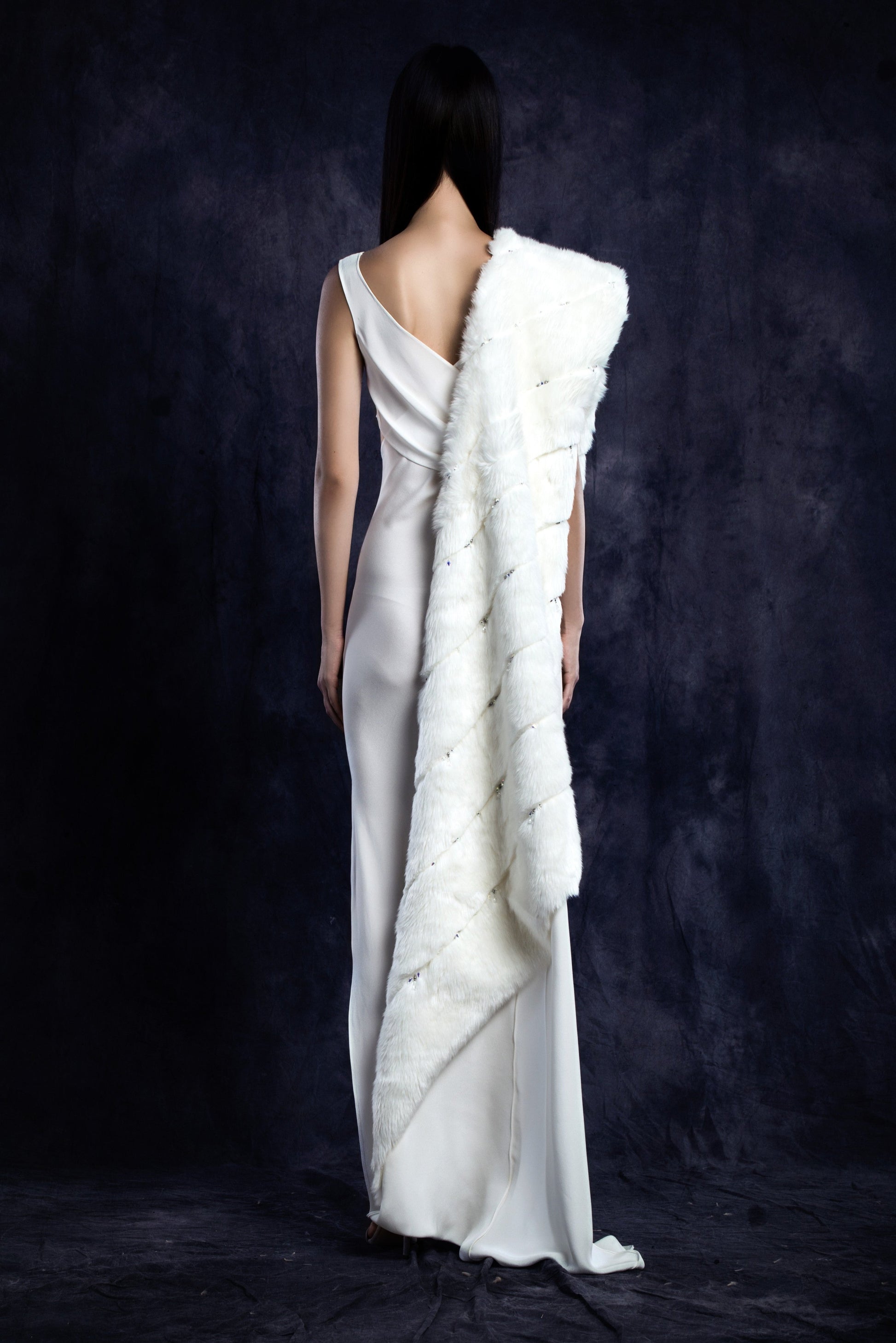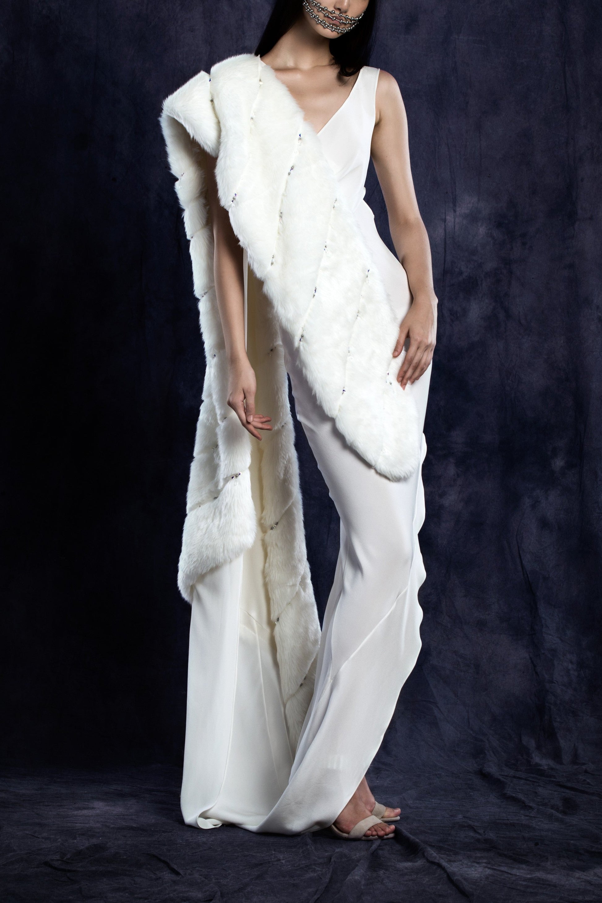Bias-cut dress crafted from two connecting panels looped around the body. Made from silk crepe, this dress features a recurring spiral motif, showcasing a built-in faux fur shawl that is connected to the dress hemline. The spiral detailing extends to the shawl with shaved decorative diagonal lines, further hand-embellished with Swarovski crystals and pearls into the crevices.