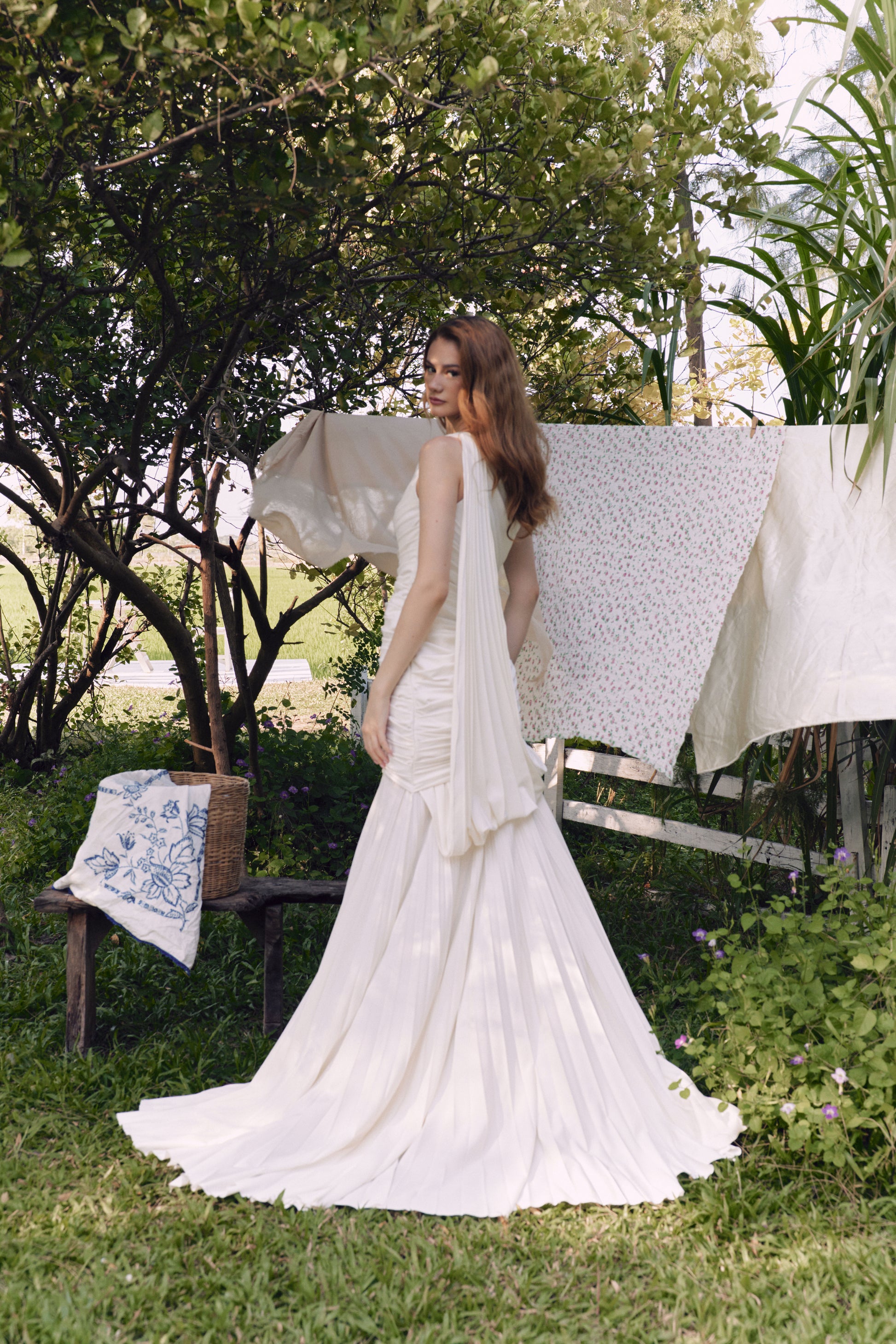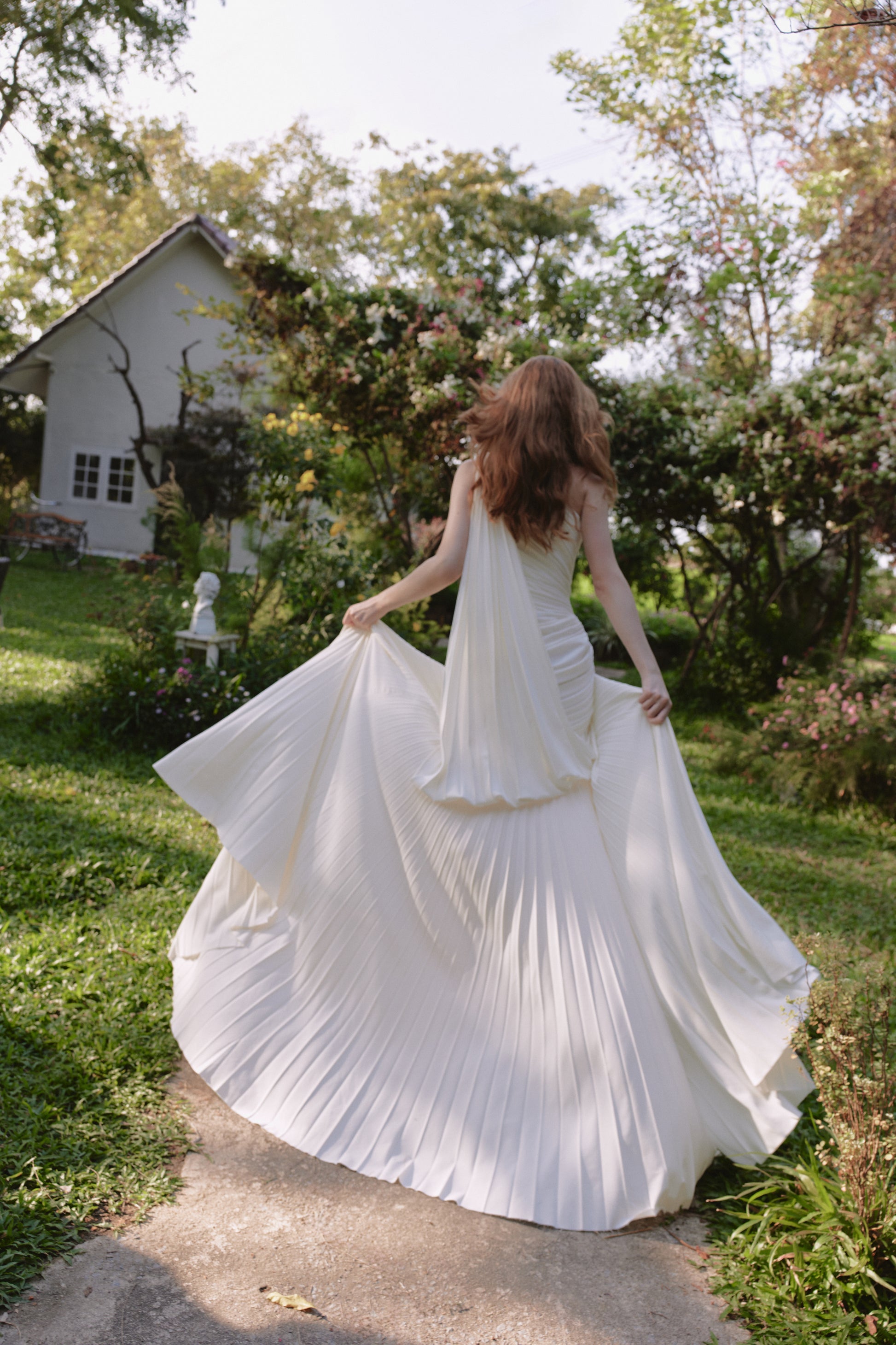 Paired with a cascading pleated back panel and skirt train that billows with every step, a poetic expression of movement and form. A vision of contradiction, where the delicate balance between restraint and release unfolds in every detail.